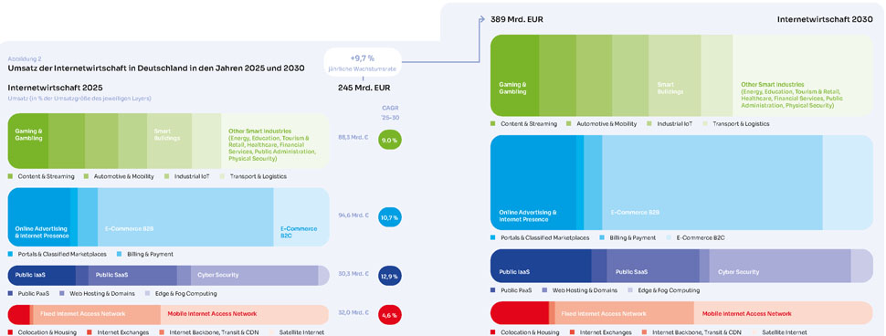 Die deutsche Internetwirtschaft wächst zwischen 2025 und 2030 pa im Schnitt um 9,7%, so Arthur D. Little für den Branchenverband ECO. Der Umsatz steigt von 245 Mio. € (2025) auf 389 Mio. € (2030), sofern strukturelle Defizite oder politische Versäumnisse das nicht behindern. |