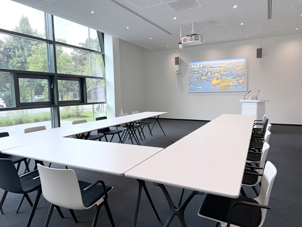 Der große Konferenzraum im Erdgeschoss eignet sich ideal für Veranstaltungen. Er ist mit einem Rednerpult ausgestattet, das identisch zu den bereits bestehenden Pulten im Bestandsbau des ZAL ist.