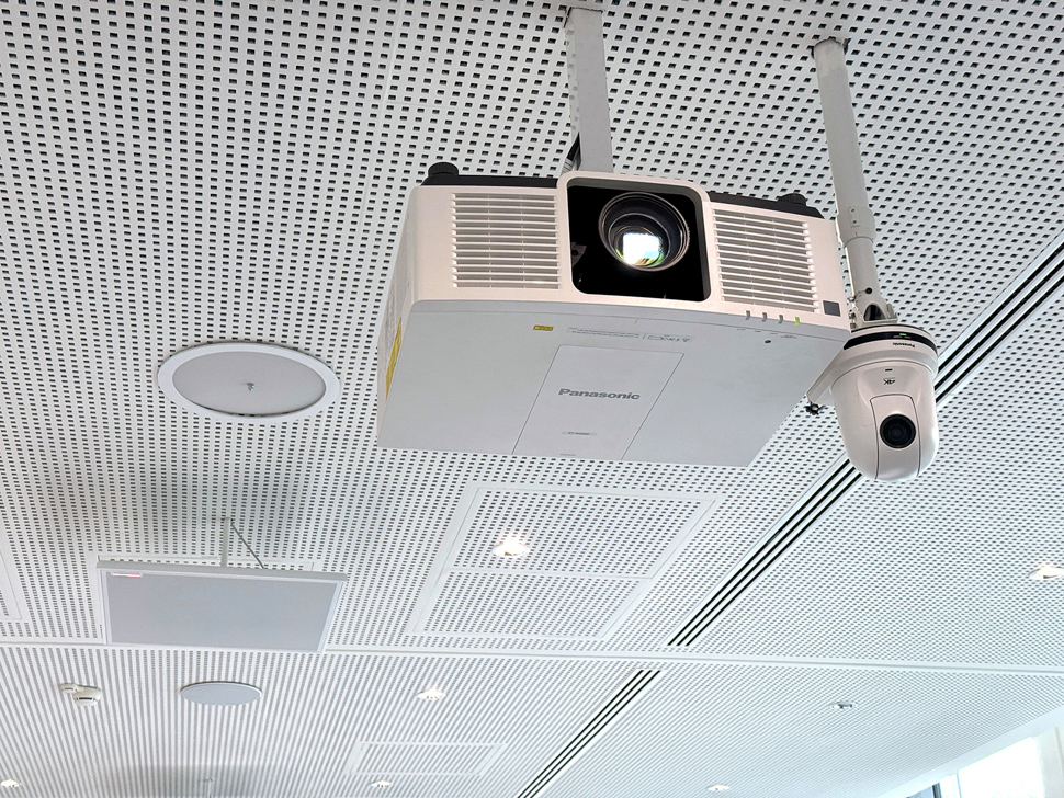 Videokonferenzen können über einen fest installierten Raum-PC von Wolfvision durchgeführt werden. Dieser unterstützt gängige Plattformen wie Microsoft Teams, Zoom und WebRTC. Für eine professionelle Videoerfassung sind PTZ-Kameras von Panasonic installiert, die sowohl den Präsentations- als auch den Zuschauerbereich erfassen.