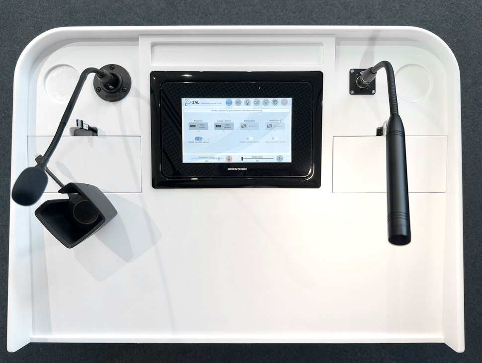 Die Steuerung erfolgt über das fest installierte 8,7-Zoll-Mediensteuerungsdisplay TS-902 von Crestron. Ein integrierter Kameramixer ermöglicht das Umschalten zwischen den beiden PTZ-Kameras sowie die Erstellung von Bild-in-Bild-Darstellungen.