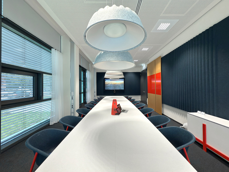Der große Besprechungsraum im Erdgeschoss ist mit einem 86-Zoll-Touchdisplay von NEC ausgestattet. Aufgrund der Raumtiefe von etwa zehn Metern wurde ein Deckenarray-Mikrofon (MXA920) von Shure installiert, um eine optimale Audioerfassung zu gewährleisten. Eine AVer CAM550 Dual-Lens-PTZ-Kamera mit KI-gesteuertem Autoframing sorgt für hochqualitative Videokonferenzen. Die Steuerung der Raumtechnik erfolgt über das 8,7 Zoll große Mediensteuerungsdisplay TS-902 von Crestron.