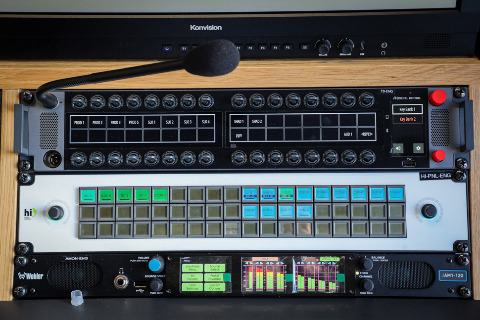 Auch im Audiobereich setzt der S12 Maßstäbe für mehrsprachige Produktionen. Eine Lawo mc²56 Konsole mit 48 Fadern, DirectOut-Interfaces sowie Genelec 5.1 Lautsprecher bilden das Herzstück der Tonregie. Ergänzt wird die Ausstattung durch Sennheiser-Mikrofone, zwei Audio/Video-Stageboxen, eine Wireless-Stagebox sowie mehrere Kommentatoren-Panels. Da viele Produktionen in der Schweiz simultan in mehreren Sprachen produziert werden, war hier ebenfalls ein Höchstmaß an Flexibilität bei der Produktion und Offenheit für Änderungen im Workflow gefordert. Für die Kommunikation und Infrastruktur sorgen eine Riedel Intercom 1024 und ein Arista-Netzwerk. Der S12 ist mit einer leistungsstarken UPS-Einheit ausgestattet, die einen unterbrechungsfreien Betrieb auch bei Stromausfall unter Volllast gewährleistet. Gesteuert und überwacht wird das Fahrzeug mit dem hi human interface System, das maximale Flexibilität und Offenheit für zukünftige Erweiterungen bietet. Damit lassen sich mit einer benutzerfreundlichen und intuitiven Oberfläche viele Prozesse vereinfachen und automatisieren.