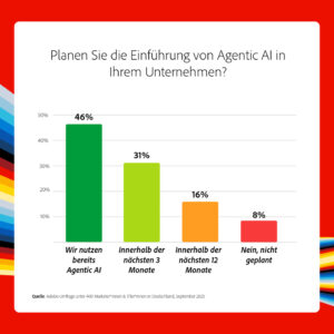 Deutsche Unternehmen gehören zu den Vorreitern bei der Einführung von Agentic AI. Laut dem aktuellen Adobe Agentic Readiness Report nutzen bereits über 90 Prozent der befragten IT- und Marketingentscheider KI-Agenten in ihren Organisationen. Die Umfrage unter 400 Führungskräften aus den Bereichen IT und Marketing wurde von TechConsult im September 2025 durchgeführt.