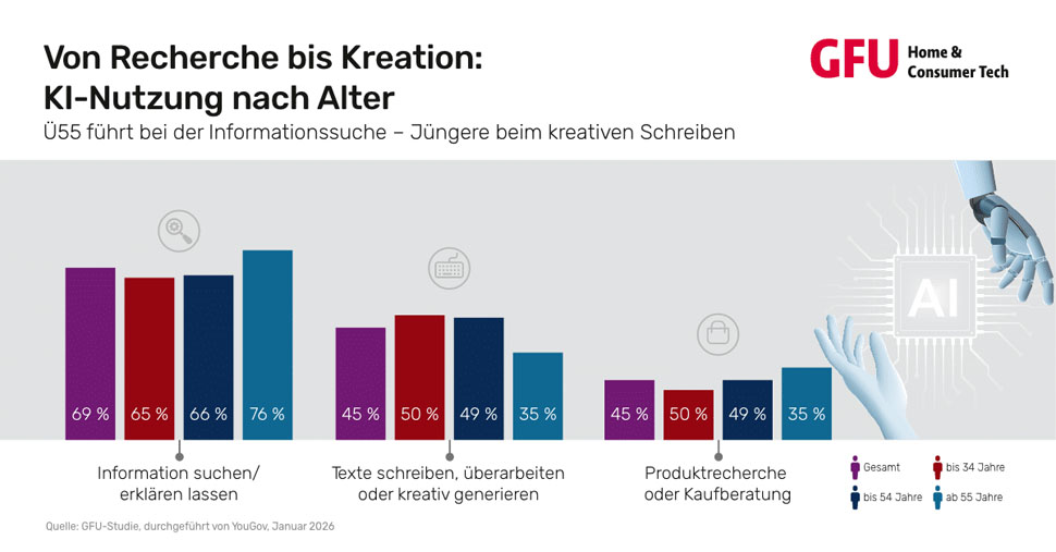 Laut einer Studie von YouGov für den Branchenverband »prägen KI-basierte Chatbots zunehmend Kommunikation und Alltag«. 69% der Befragten nutzen Chatabots, teils sogar mehrfach pro Woche, mehr als 25% täglich. Dies besonders bei den 18-34 Jährigen. KI ersetze vor allem beim Suchen (84%) und in Fachportalen (52%) generative KI-Konzepte.