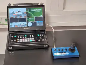 Ein Herzstück des Raumes ist der Bildmischer von AVMatrix. Dieser bündelt alle PTZ-Kamera-Signale und von Laptops übertragene Präsentationen. Er ermöglicht das Umschalten zwischen diesen Quellen und kann auch Bild-in-Bild-Darstellungen ausgeben. Per einfachem USB-C-Kabel wird er von dem Videokonferenz-PC wie eine Webcam erkannt und trägt so zur einfachen Bedienung des Systems bei.