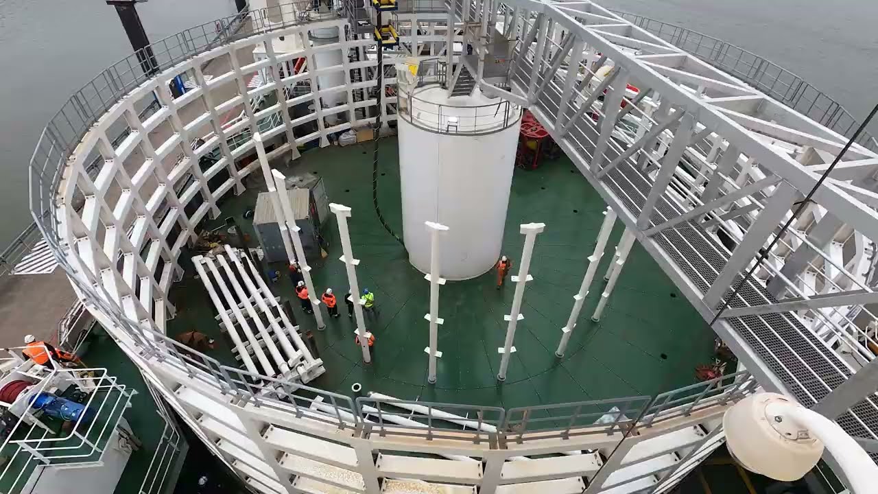 Das Schiff weist sieben Kontrollräume auf. Die Hauptkontrollräume blicken nach achtern, auf das Deck, wo die Kabelrolle liegt — und darüber hinaus.