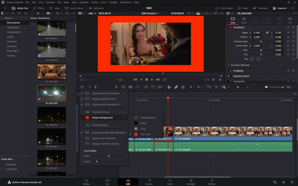 Der Hintergrund im Timeline Viewer kann rot oder grau eingestellt werden.