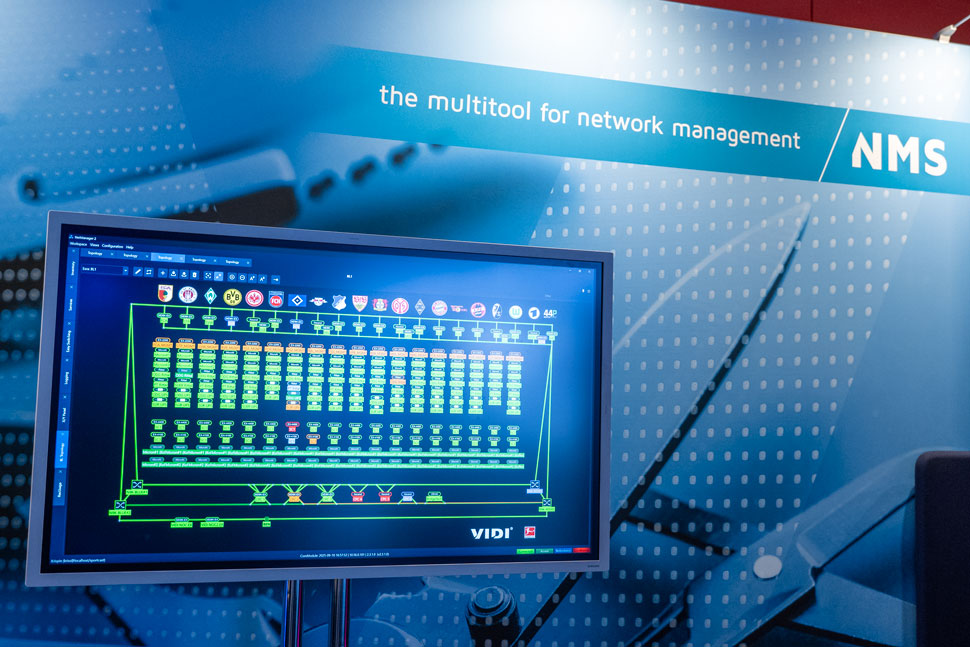 Software-Entwickler Gianni Weinand demonstriert im Video das Network Management System (NMS), das alle Bundesliga-Stadien über redundante 10G-Glasfaserverbindungen steuert.