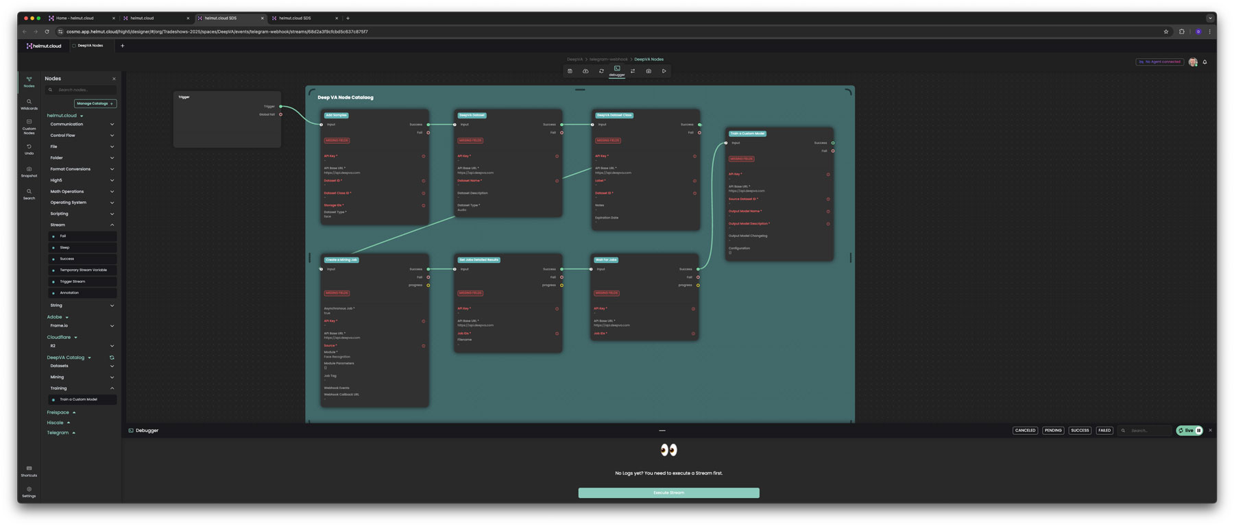 Der Workflow umfasst mehrere Schritte: Verifizierung des Video-Files, Abruf der Informationen aus Telegram, Download des Assets, Einchecken ins System und abschließende Face Recognition mit dem Modell »DeepVA Helmut«, das auf die Gesichter der Teammitglieder trainiert wurde.