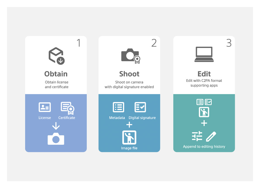 Um die Signaturfunktion in Kameras nutzen zu können, sind eine Lizenz für digitale Signaturen und deren Installation auf Sony-kompatiblen Kameras erforderlich. Sony wird Lizenzen für digitale Signaturen für Videos bereitstellen, die für die Nutzung der Signaturfunktion der Kamera erforderlich sind. Darüber hinaus wird die cloudbasierte Kollaborationsplattform von Sony, Ci Media Cloud, nun C2PA-konforme Informationen zu digitalen Signaturen anzeigen und so die Authentizität von Nachrichteninhalten verbessern.
