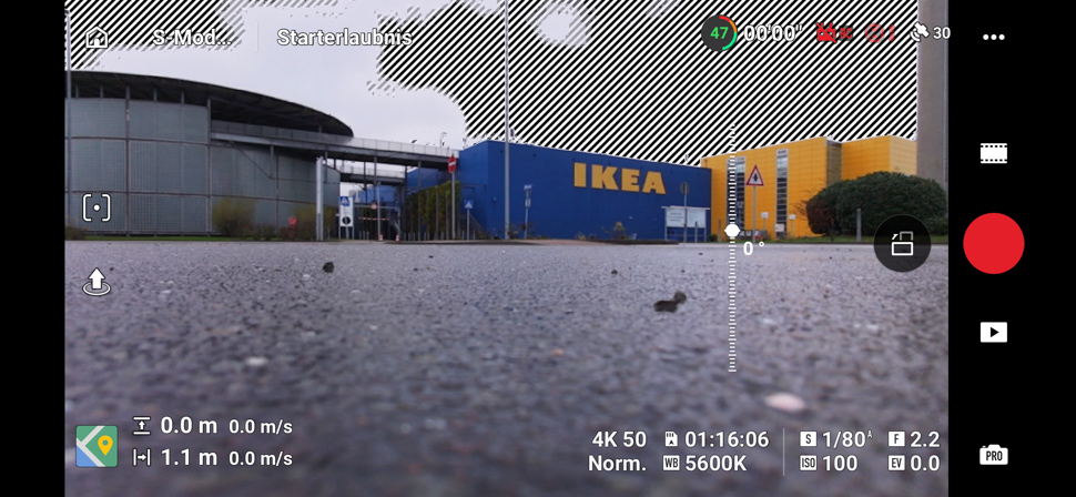 Übrigens beträgt die Reichweite ohne das Übertragungsmodul per Wi-Fi nur 500 Meter, in der Praxis wahrscheinlich weniger. Wir hatten für unseren Test eine Vorversion der DJI Fly App. Das heißt, einige Funktionen waren noch nicht verfügbar. So konnte ich nicht herausfinden, ob der EIS immer aktiv ist. Eine Einstellung für diesen gab es in unserer App-Version nicht. Man kann ihn beim FPV-Modus allerdings über die Brille abstellen.