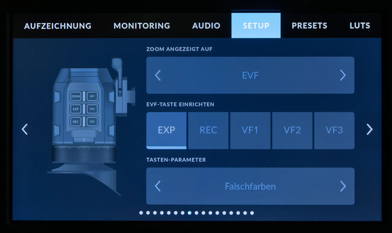 Drei Funktionstasten sind wenig. Benutzt man einen Sucher mit speziell darauf eingestellten Tasten auf der Oberseite, reicht es für eine normale Drehsituation. Auch die Tasten am Sucher lassen sich im Menü einstellen.