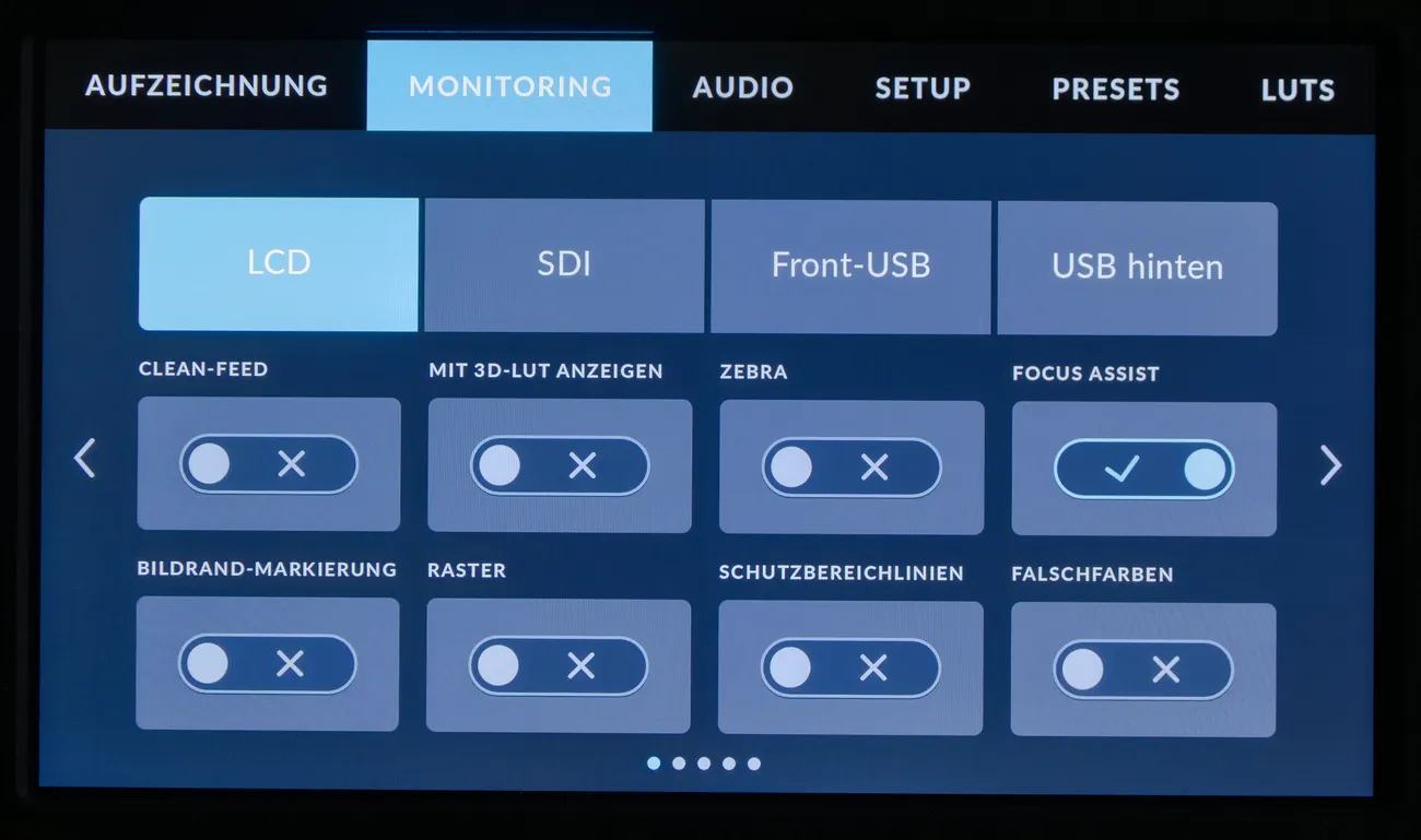 Als Assistenten, um die Belichtung beurteilen zu können, gibt es ein Histogramm, das auch in RGB angezeigt werden kann, eine Falschfarbendarstellung und eine Zebra-Anzeige. Letztere lässt sich auch in der Pyxis 12K, wie in allen BMD-Kameras, nur zwischen 75 und 100 % einstellen – eine Beschränkung, die einfach keinen Sinn macht, schon gar nicht, wenn man im Film-Modus aufnimmt. Die Falschfarbendarstellung bietet zwar eine sehr viel differenzierte Darstellung für die Belichtung, doch sie ist kaum während der Aufnahme zu verwenden. Mit viel Übung und dank der Legende auf der Seite kann das aber dennoch eine Option sein.