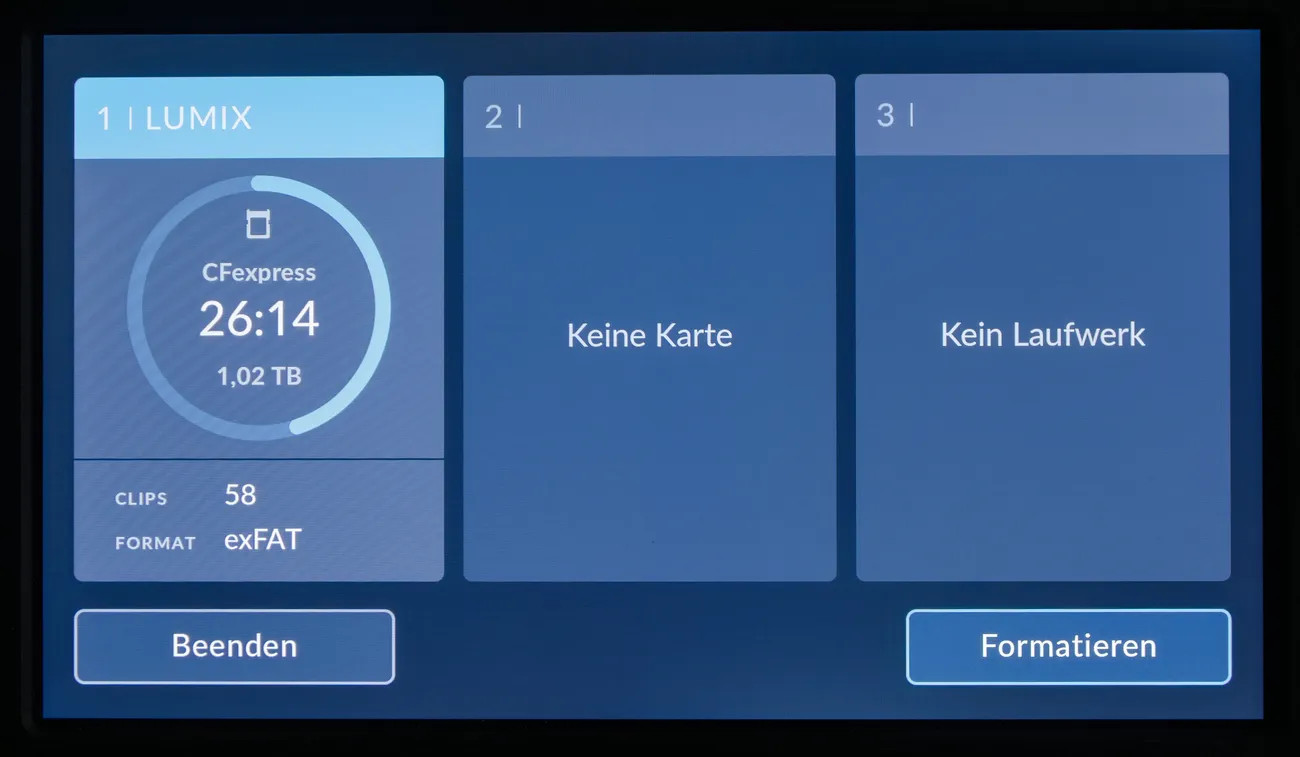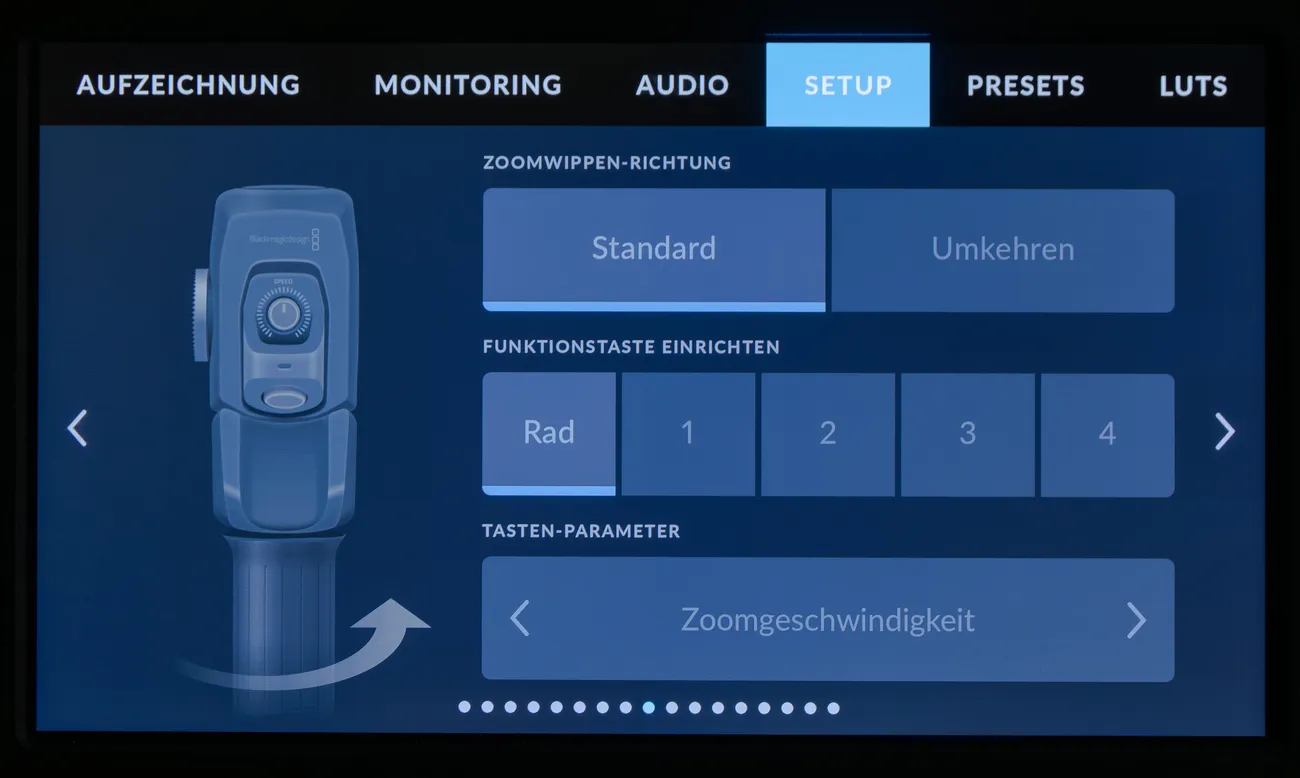Eine Einstellung im Menü, um den Zoomfaktor für die Taste vorab zu definieren, gibt es nicht, aber wenn ein Wert einmal eingestellt wurde, springt die Kamera wieder in diesen Wert und die Position, wenn die Lupen-Taste erneut gedrückt wird. Ändert man die Auflösung oder wechselt man den Akku, ist die Einstellung wieder weg. Klickt man im Zoom-Modus auf das Blendenrad, kann auch mit dem Rad die Position eingestellt werden. Es ist nicht ganz einfach, diese Funktionen von der Schulter aus zu bedienen und nicht versehentlich die HFR-Taste zu betätigen, aber mit etwas Gewöhnung funktioniert auch das ganz gut.