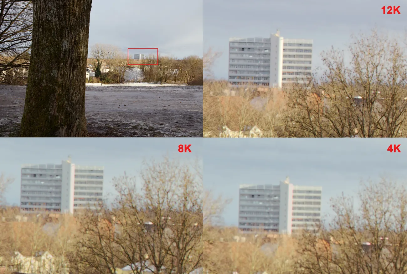 Eine 12K-Aufnahme und eine 8K-Aufnahme auf einer 8K-Timeline und eine 4K-Aufnahme auf einer 4K-Timeline. Der Ausschnitt ist um 850% vergrößert.