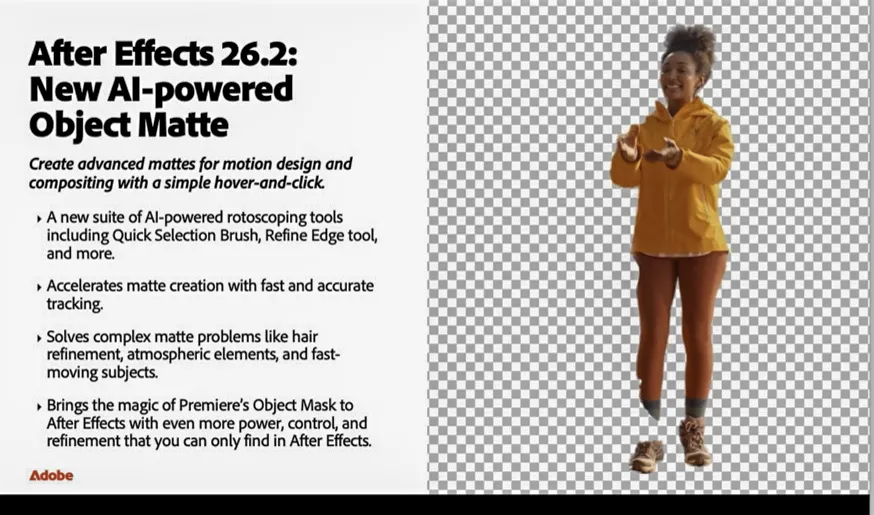After Effects 26.2 bringt das Object Matte – eine vollständige Suite KI-gestützter Rotoscoping-Werkzeuge, die direkt auf der Hover-and-Click-Technologie des Premiere-Objekt-Masks aufbaut, aber deutlich tiefer geht. Zum Paket gehören Quick Selection Brush, Refine Edge Tool und präzises Tracking einzelner Haarsträhnen. Auch schwierige Fälle wie schnelle Bewegungen, atmosphärische Verdeckung und komplexe Hintergründe sollen damit beherrschbar werden. Das Feature ist ab sofort verfügbar.