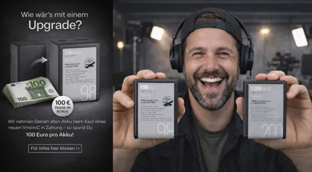 Die Tauschaktion macht den Umstieg attraktiv: »Alte V-Mount Akkus – egal welcher Hersteller, egal ob defekt oder funktionstüchtig – werden mit jeweils 100 Euro beim Kauf eines neuen VmicroC Akkus angerechnet«, verspricht Bebob und sichert deren fachgerechtes und gesetzeskonformes Recycling zu.