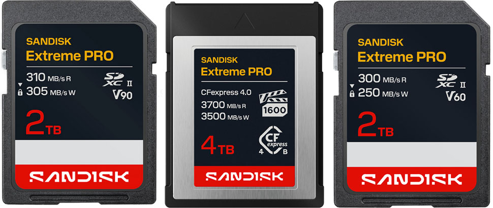 Extreme PRO SDXC UHS–II V90. Die V90-Karten unterstützen 8K-Video mit dauerhaft hohen Schreibgeschwindigkeiten bei Kapazitäten von bis zu 2 TB. Eine 2-TB-Karte speichert über 1.118 Minuten 8K-Video mit 30 fps. Sie werden mit Lesegeschwindigkeiten bis 310 MB/s und Schreibgeschwindigkeiten bis 305 MB/s (512 GB–2 TB) angegeben und sind bereits im Handel erhältlich.