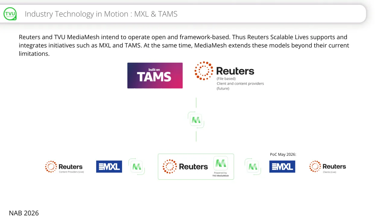 Technologische Basis bildet eine Kombination aus TVU MediaMesh, MXL und TAMS. Über das Reuters-eigene Live Production Exchange Protocol (LPX) werden die Workflows per API gesteuert – sobald ein Event eintritt, aktiviert LPX automatisch die entsprechenden TVU-Prozesse. Das System schlägt damit eine Brücke zwischen Live- und File-basierten Workflows, was für Reuters eine zentrale Anforderung war.
