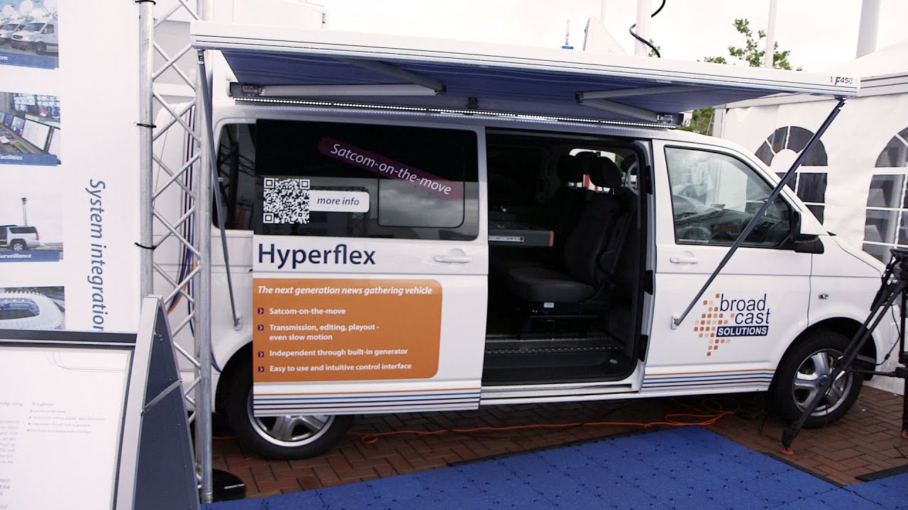 Mit Hyperflex hat Broadcast Solutions ein kompaktes Reportagefahrzeug für die schnelle Berichterstattung konzipiert. Live-Produktionen — auch mit ferngesteuerten Dome-Kameras — sind damit möglich. Außerdem können vor Ort und auch während der Fahrt Beiträge bearbeitet und ins Funkhaus übertragen werden.