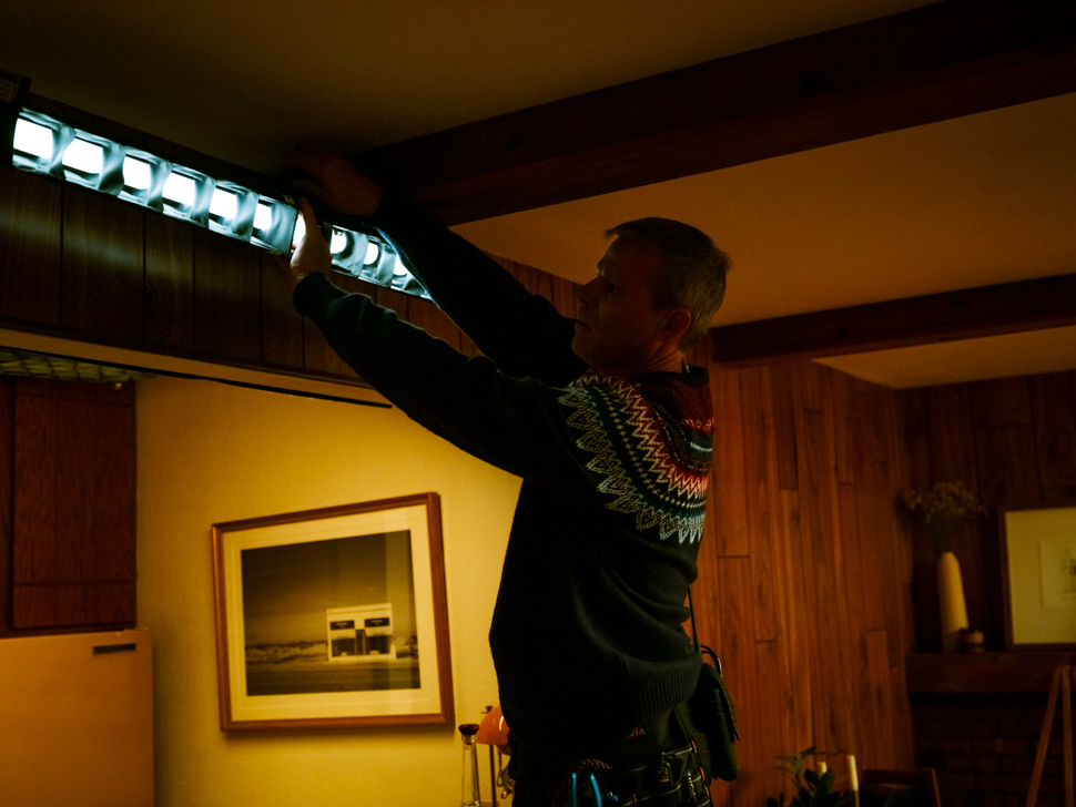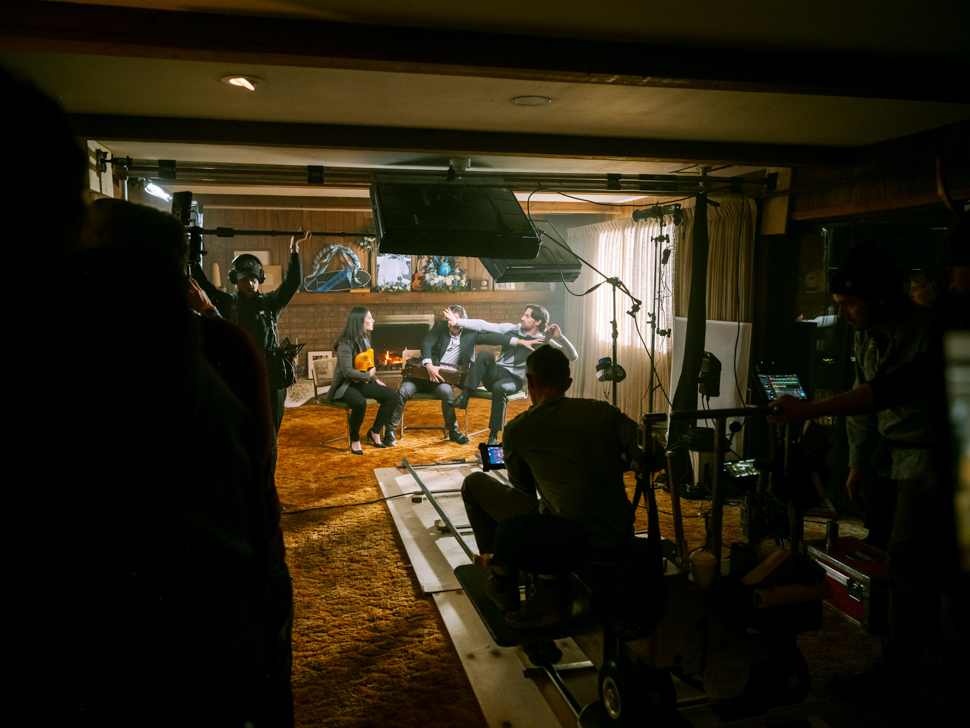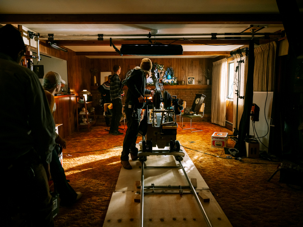 Die Videokampagne von Trust & Wills spielt in einem Haus aus den 1970er Jahren mit Holzvertäfelungen und hochflorigen Teppichen und zeigt erwachsene Geschwister, die eine Erbschaftsschlacht parodieren. »Die Zusammenarbeit mit Kameramann Brian Hollers war großartig, er ist sehr kooperativ. Die Dreharbeiten erforderten eine lange Kamerafahrt mit einem Fisher 11 Dolly und einem Jib-Arm«, sagt Kaschke. »Das Haus hatte niedrige Decken und einen einzigartigen, stilisierten Look. Wir verwendeten Astera Tubes und LiteMats, die zwar hervorragend sind, aber dazu neigen, das Licht überall zu verteilen, wenn man es nicht kontrolliert.« Mit einer Deckenhöhe von 2,40 m und einem großen Dolly-Jib war der Platz sehr begrenzt. Aber Kaschke ließ sich davon nicht beirren – er hatte bereits genau das, was er brauchte, in seinem Gaffer-Van.