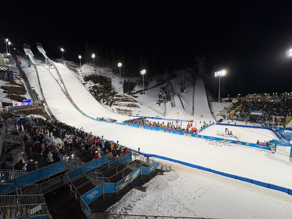 Skispringen in Predazzo ist das zweite größere Venue, setzt aber auf eine andere Anbindungsphilosophie: Statt einer Glasfaseranbindung wird hier eine 250-Mbit/s-Internet-Leitung genutzt. Die Signalübertragung nach Mainz erfolgt mit LiveU-Systemen.