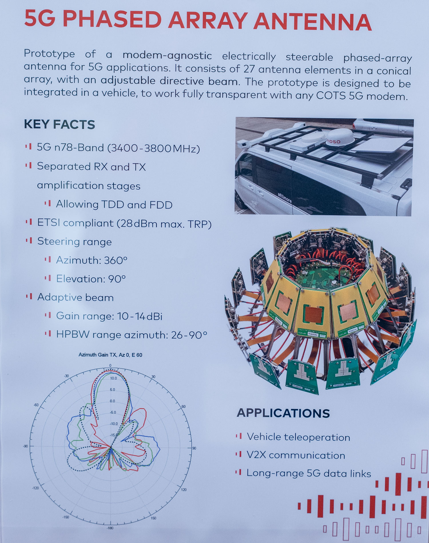 Hierzulande wird autonomes Fahren eher für Transporteinsätze evaluiert. Für genau so eine Anwendung im Transportbereich hat PIDSO eine 5G Phased Array Antenne mit 27 Antennenelementen entwickelt. Damit ist es möglich, autonome Transportfahrzeuge über das bestehende 5G-Mobilfunknetz zu steuern. Ein knollenförmiger Antennen-Beam wird dabei in alle Richtungen nachgeführt.